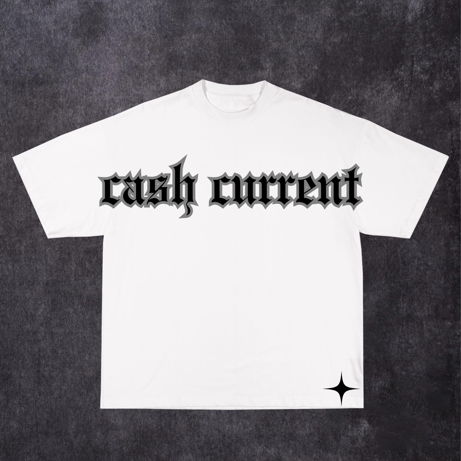 A white Cash Current T-shirt with a clean, bold streetwear look. Made to represent hustle and everyday style.